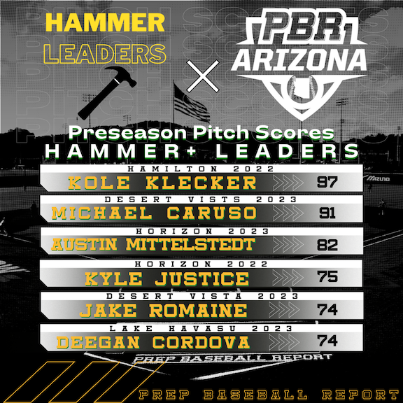 Through our Preseason events held in January of 2022, PBR Arizona really dialed in on these pitch scores, and are now shining some light on the top scores from three different categories: Hop+, Hammer+, and Sink+.