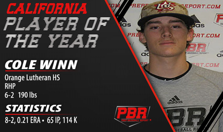 Cole Winn of Orange Lutheran High School (Orange, CA) has been named the 2018 Prep Baseball Report California State Player of the Year.