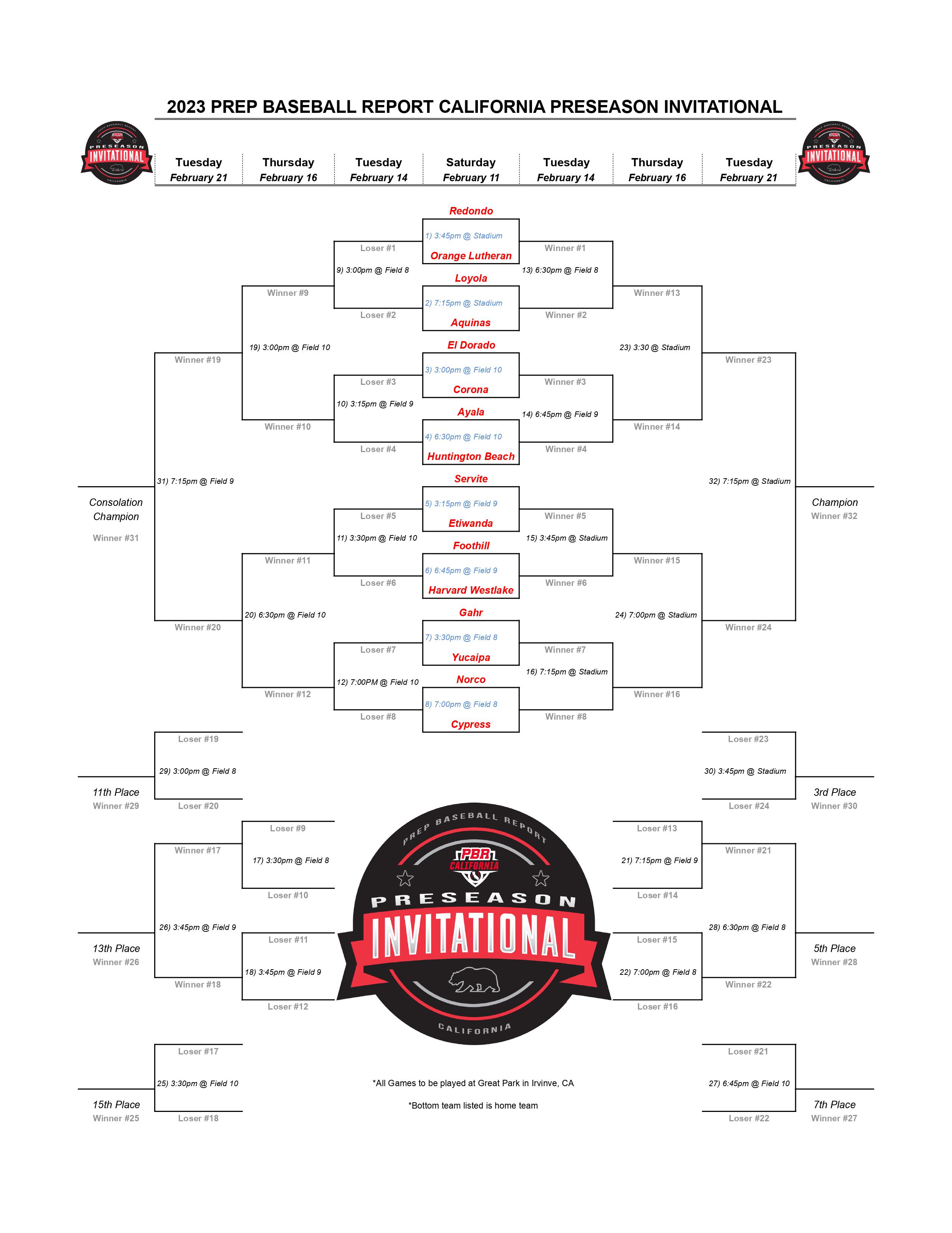 Games will take place Saturday, February 11, Tuesday, February 14, Thursday, February 16, and Tuesday, February 21, 2023. All games will be played at the Great Park on all four baseball fields. Be sure to check the bracket for games times and field locations.