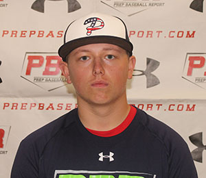 8.23.15 - 5-foot-10, 160-pound, right-handed hitting outfielder with a strong frame. Offensively hits from a tall, open stance with a short leg lift stride. Line drive hitter with a short swing path. Showed strength thru contact with 84 mph exit velocity from a tee. Ran the 60 at 7.00. Defensively has a short arm action from an over the top arm slot. Accurate throws that flashed carry. Plays thru the ball with a clean exchange and fluid footwork. Threw 76 mph from the outfield.