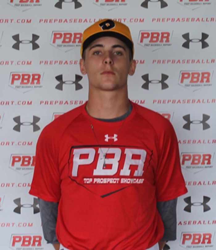 7.26.16 - 6-foot-2, 185-pounds, strong physical build, advanced physically for his age, left handed hitting catcher. Hits from a slightly open stance, arm bar load, minimal stride. Has bat strength, longer uphill path, power potential bat. 89 mph exit velocity from the tee. Defensively arm played short and over the top, misses were arm side, 75 mph out of the crouch. Pop times ranged 2.05-2.11. 4.47 runner down the line.