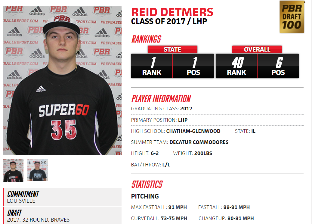 In at No. 4 in our countdown is the No. 1 ranked prospect in Illinois' Class of 2017 and No. 40 Overall, current Louisville Cardinal, LHP Reid Detmers (Chatham-Glenwood, 2017). Detmers' profile garnered over 5,930 views. The most activity Detmer's profile saw occurred on June 14th, when the Atlanta Braves drafted him in the 32nd round.