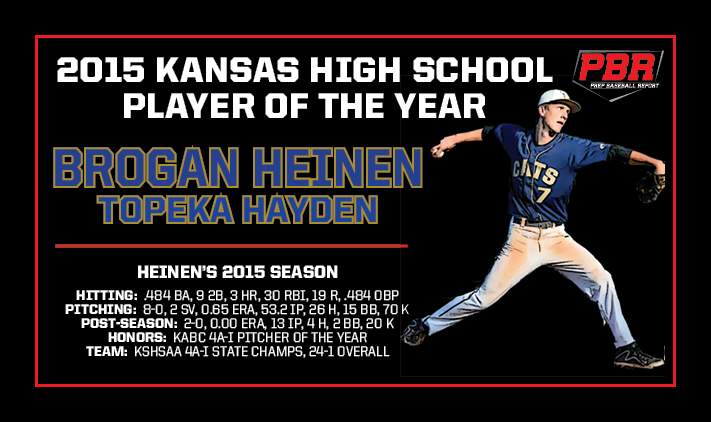 Topeka Hayden senior RHP/1B Brogan Heinen, last spring’s KABC 4A-I Player of the Year and the 2015 KABC 4A-I Pitcher of the Year, has been named the 2015 Prep Baseball Report Kansas High School Player of the Year.