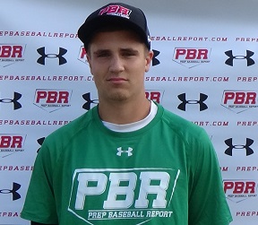 8.4.15 - Hits from an open setup. Leg kick to square position. Level swing path with extension. Slight drift and some lower half usage. Has some bat speed. Shows balance throughout swing. Exit velocity of 79 mph. Clean footwork from the corner. Clean exchange to release. Throws across the diamond got up to 77 mph. Ran a 7.34 60-yard dash.