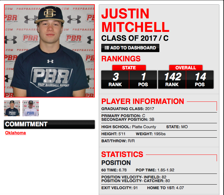 Mitchell, an Oklahoma commit, s a 5-foot-11 195-pound right-handed hitting catcher in the 2017 class. Mitchell is combination of strength and athleticism. He runs a 6.78 60 and posted a 91 mph exit velo, both among the top for the event. At the plate, starts with a wide stance, uses a toe touch to load, minimal movements in hands. Level path to extension, fast bat speed, ability to hit to both gaps. On the infield, Mitchell posted one of the top velos on the day at 82 mph, quick feet, has range laterally, over-the-top release, clean exchange, accurate throws. During catching evaluations, quick movements in glove-to-hand exchange and feet, over-the-top release, aggressive momentum towards second base, pop times between 1.85 and 2.00. Stands out on the football field as well as quarterback for high school team.