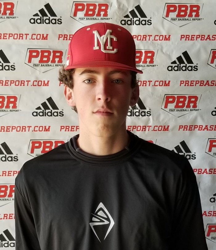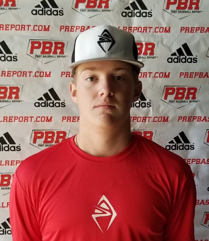 Brendan Burke C / 3B / Panther Creek, NC / 2021Physical for his age with an average frame at 6-foot-2, 190 pounds. Left handed hitter creates some leverage with an exit velocity peaking at 88 mph off the barrel. Open in his stance, strides back toward the plate. Slight leg kick to load his weight. Some waggle in the bat head through the launch, but repeats his launch position. Strength over quickness, the swing is geared to the pull side wanting extension. Barrel awareness should improve with more quickness. Behind the dish, shows some bend through his hips but when working to exchange, the hips cheat up and there is an early false step. Exchanges across his belly to a medium arm swing and high-3/4 release. Positional velocity of 74 mph yielded pop times ranging 2.10 – 2.12 with misses to the 3B side. At first base, tends to catch the ball deep but secures it to the midsection. Feet fight for rhythm. Arm showed accuracy on throws peaking at 74 mph. Ran a laser timed 60 at 8.18. |
