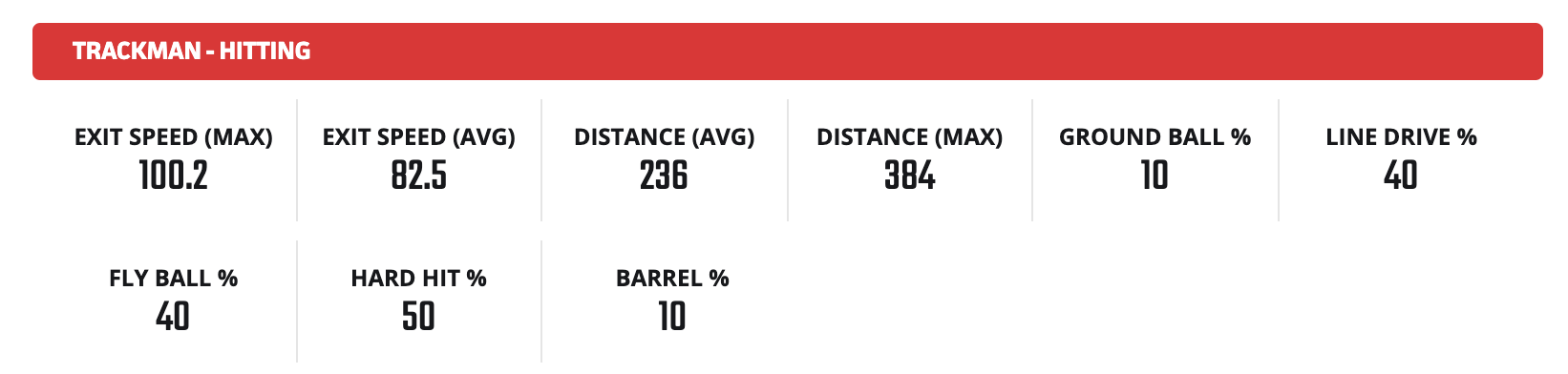 Exit Velocity- It does not take a hitting expert to tell you that hitting the ball hard is a good quality to have as a hitter. So it should not be too much of a shock to say if you can hit the ball 100 MPH like Matthew McIntire, you're probably doing something right in the box. The triple digits in the max exit velocity category will always catch my eye. The average exit velocity for McIntire also caught my eye, but because one would not expect an average exit velocity of 82.5 MPH for a guy who can hit the ball 100 MPH. When diving into why there is such a big difference, it was really just a few outliers that pulled down the rest of the set. If you took those two outliers out of the data set, his average exit velocity would be just above 91 MPH.