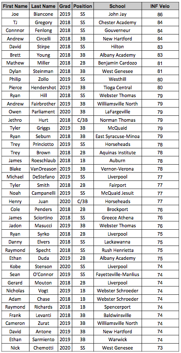 With Monday's Preseason All-State event held at Sport Center 481 in East Syracuse, NY in the books, it's now time to collect the massive amounts of data and sort through our statistical leaders. Among 58 infielders, 2019 SS Joe Biacone (John Jay-Cross River) lead the way with a peak velocity of 86 MPH. Ten others breached the 80 MPH mark, here's our leaderboard: