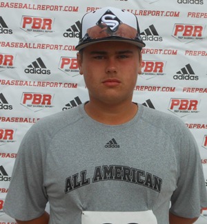 Garret Baker 1B / RHP / Mustang, OK / 2021A physically impressive 6-foot-4, 225-pound frame. Offensively, the right-handed hitter bats from a wide, open, and back leg heavy set-up with slight rhythm in his hands. Uses a smooth load and moderate stride before launching his hands on a flat path through extension with some bat speed and strength. In BP, shows a middle to opposite field approach with some lift, mostly barrels, 80 mph exit velo. Runs an 8 second 60. Defensively, at first base, shows deliberate feet and hands when fielding with quick footwork towards second to complete the play. Throws with a long arm stroke coming through a 3/4 slot with arm strength, 79 mph across the diamond. |