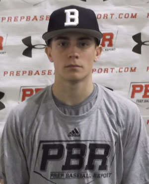 2-3 Cleveland State commit delivered a couple hits. Medium, athletic frame w/ lean strength, projectable. Offensively, hits w/ a straight on, slightly crouched stance w/ short hand rhythm into proper stride and load. All at bats on this day were from the right side. Generates bat speed through the zone. Pull oriented approach w/ lot of line drives when right. Projectable pull power, one hopped the wall w/ what may have been a triple if the bases were empty. Defensively, shows soft hands and easy arm strength, projects to stay at the position at the next level. |