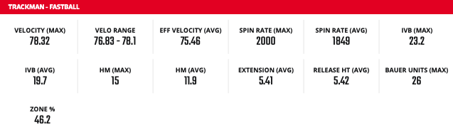 Tanner Schaedel’s fastball: Sat around 76-77, touching 78.3 with low release height of 5.42. He threw his fastball for a strike 46.2% of the time. Tilts ranged from 12:45 to 1:15, the fastballs at 12:45 had about two more inches of IVB than his average fastball thrown which had 19.7 inches. His lowest VAA was 4.8 degrees, but thrown for a ball, so his best VAA on a pitch in the zone was 5.1 degrees. Averaged 1,849 raw spin and 25 bauer units. His highest single pitch IVB was 23.2 inches, only four players on the day threw a pitch with more vertical movement.