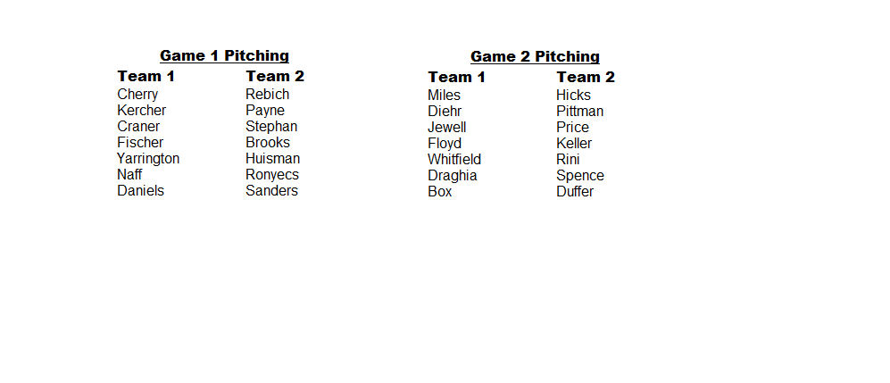 Here is the Pitching Schedule for the games, pitcher onlys need to arrive at least 30 minutes prior to their scheduled game.