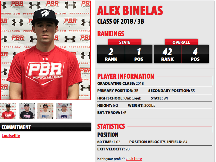 3B Alex Binelas (Oak Creek) is currently the No. 2 ranked player in the Wisconsin 2018 Class. Binelas carrying card has been his bat, and he swung a hot bat this past fall. His profile saw over 8,500 views in 2016.