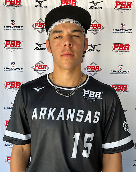Jackson Estes: LHP/OF, (2025) North Little Rock, AR. 5-foot-11, 167-pound projectable lean frame. Fluid during batting practice, Estes best exit velocity was 89 mph. Began in a balanced stance with a smooth controlled load, then used a small leg kick. Has average bat speed, short upward swing plane and high finish. He barreled up multiple balls with a lot of loud contact. Gap to gap approach. Solid from the outfield, he displayed a position velocity of 82 mph; had soft consistent hands, a quick fluid exchange, and smooth rhythmic footwork. Fielded the ball out front with athletic movement laterally. Recorded a 60 time of 7.8 at the event. Projectable on the mound, showing quick arm speed he had a long arm action and an over-the-top arm angle. Up-tempo type pitcher and uses some effort. Showed consistent balance point and in line shoulders. Lands square with a falling off finish. Sat with his fastball at 77-80 mph; had a straight fastball that showed tilt and glove side control. Shows command around the zone and early action on his 1/7 curveball (59-61). Threw a straight changeup (65-67) with slight action and arm side command.