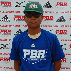 Small, young, lean frame (8.00 60yd). High hands, balanced stance using simple toe-tap working with loose hands on upward path (82 EV); compact swing working short line drives. Chops step working laterally with glove out in front of him; arm is loose and full working accurately to the bases (77 MPH).