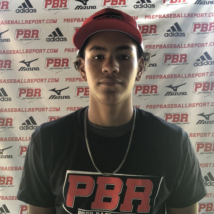 5-foot-11, 180-pound, average athletic frame, squared off shoulders, wider back, already filling. A left-handed hitting outfielder, at the plate is super balanced, wider setup, relaxed loose hands at the shoulders. The lower half is under control, uses large leg kick, gains ground, stride is inline, hitting against a firm front side. The swing works with easy effort through the zone, gets through the baseball, level to up path. The approach is more middle to pull side, shows plus pop to right-field, had an exit velocity of 90 mph and ran a 7.60 sixty-yard dash. From the outfield, approach is under control, showing a clean arm, clocked at 72 mph. All throws were downhill, and on target off the mound, mixed a two-pitch mix, fastball was clocked at 72 mph, located down in the zone. The breaking ball was clocked at 58-62 mph, needs more fastball hand speed. The delivery is simple, easy lift inline direction. Projecting out more as an outfielder, serious potential to hit at some point.
