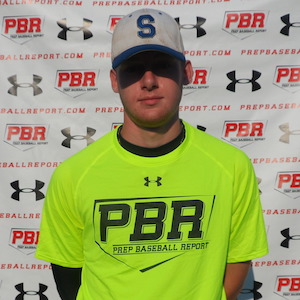 At 6-foot-3, 200-pounds the frame is large and has some serious strength to him. Hits from the left side, the stance is a bit wider than shoulder width and slightly open. The hands are set above the shoulders and are loose with a little movement to them, trigger is small. The lower half is under control with a small stride. The path is level through the zone and finishes with one hand, does a very good job of keeping the barrel in the zone, showed the ability to go the other way, plate coverage is good. The tee exit velocity was 81, with much more in there. Runs well for a big kid, was 4.46 down the line. Behind the plate, setup is balanced, the front side is weak, throws with only his arm, needs to get more of entire body involved. The arm was 65 on the gun and times to second were 2.27-2.44. The potential to hit and hit with big power is there, reps and at bats are a key, big time bat for me.