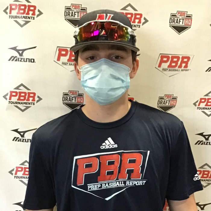 5-foot-11, 167-pound right-handed hitting catcher and infielder. Ran a 7.81 sixty on the laser at the event. Threw 75 mph from behind the dish as the feet work and the transfer needs to continue to improve. The pop time was 2.0. The receiving needs to continue to progress, softening and securing the catch needs to progress as he matures in age. In the infield, threw 75 mph as the feet need to remain active during the approach to the ground ball. The bat has a tee exit velocity of 84 mph. The setup is open to start, front foot closes down as the ball approaches. The bat path is uphill as he produces top spin on the ball at contact. Uses a 1-handed finish after contact.