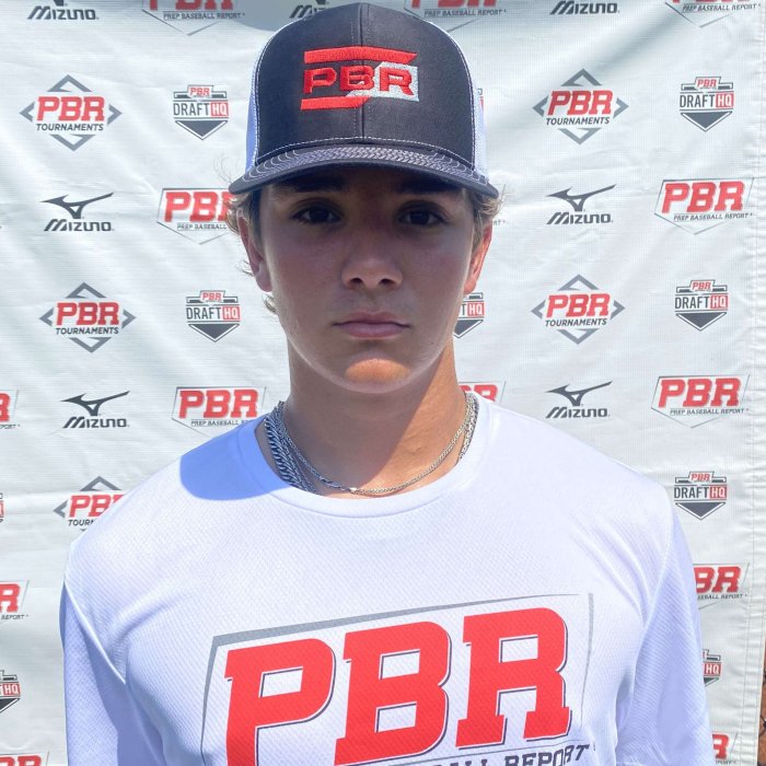 5-foot-11, 175-pound, average athletic frame, sloped shoulders, shows good strength for a 2023. A left-handed hitting left side infielder, at the plate is super balanced, a wider setup, even feet, loose relaxed hands with pre-pitch movement to them. The swing is level through the zone with a higher finish, an all fields approach. Took a very solid round of batting practice, length in the gaps, with an exit velocity of 89 mph. Defensively, moves well to both sides, shows a soft backhand, glove is out front on the catch. The double play starts were clean, arm was clocked at 81 mph. Showed feel for the pro move. Off the mound, pounded the zone with a three pitch mix, fastball up to 81 mph. Breaking ball has some velocity to it, clocked at 68 mph, feel for a true changeup. The delivery is deliberate and controlled, stays over the backside, staying strong over the backside, landing inline. The arm action is longer and clean. Projecting more as position player, love the feel for the bat.