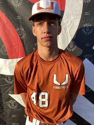 Ryan Miressi: OF/SS, (2025) Greens Farms Academy, CT. 6-foot, 160-pound lean athletic build. Above average projectable in the box, Miressi clocked an exit velocity of 86 mph. (60.7 mph bat speed average). (17.7 mph hand speed average). Begins in a tall athletic stance with a tight compact load, then uses a controlled stride. Bat speed is electric, uses a loose upward swing plane and high good extension on his finish. Found multiple barrels with tons of loud contact. Gap to gap aggressive approach. Above average from the outfield, he made throws to the infield at velocities up to 79 mph; showed aggressive quick feet, a twitchy exchange, and soft hands. Laterally, movements were quick and fielded the ball out front. Consistent accuracy to the bag, used a high ¾ slot with a short arm action.