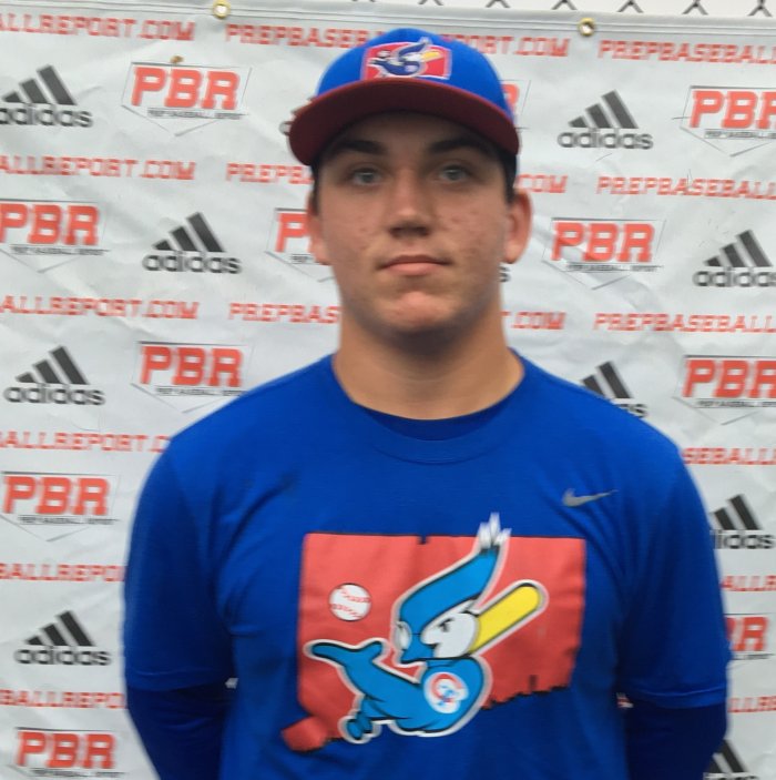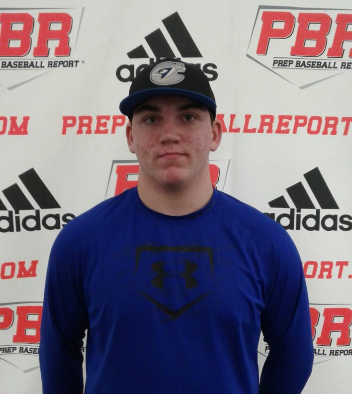 5-foot-11, 200-pound right-handed hitting catcher and third baseman. Ran a 7.88 sixty on the laser. Threw 73 mph from behind the dish, pop time of 2.11. The feet needs to be ironed out to aid the throwing during the transfer. The receiving is a work in progress, as securing the catch and handling secondary pitches needs to continue to improve. The bat has a tee exit velocity of 85 mph, the hands are very strong. The set up is wide in base, still takes a big step into the ball as he start the swing. The path is long and strong through contact, uses a 1-hand finish after contact. The bat has improved since we last saw him. Also played third base in game play, glove is average and he made all the throws.
