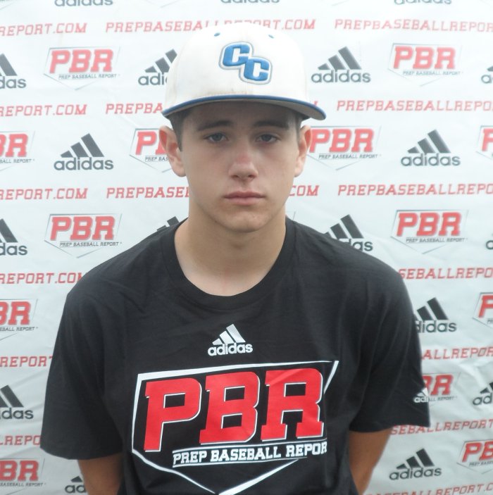 6-foot, 175-[pound right-handed hitting catcher and infielder. Ran a 7.34 sixty on the laser at the event. The skill set behind the dish is very good, can really throw, 81 mph down to second base with a pop time of 1.87. Would like to see him simplify his feet and improve on securing the catch as he matures. The approach in the infield is athletic and he keeps his feet moving, threw 83 mph across the diamond. The bat has a tee exit velocity of 81 mph. The setup is wide in base, front foot open to start. Uses a knee to knee approach on the bottom half as the ball approaches the hitting zone. The path is a bit uphill with lift. Would like to see that flattened out to aid better plate coverage. Solid prospect