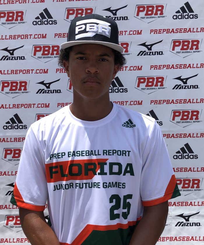 Florida State Commit, 6-foot-1, 180-pound strong athletic frame. Above average projectable during batting practice, the right-handed hitter had an exit velocity of 97 mph. (73.52 mph bat speed average). (20.46 mph hand speed average). Began in a tall balanced stance with a smooth rhythmic load, then used a short leg kick. Bat speed was electric, showed a short swing plane and good extension on his finish. He barreled up multiple balls with a lot of loud contact. Gap to gap line drive approach. Above average projectable in the outfield, he showed a plus arm and had life on his throws with a position velocity of 94 mph; showed a quick clean exchange, athletic feet, and next level hands. Fields the ball out front, movements laterally were athletic. Established speed as one of his strengths with an efficient 60 time of 6.22. Projectable on the mound, showing lightning arm speed he had a long arm action with a high ¾ arm angle. Drop-and-drive type pitcher who uses easy effort. Showed athletic balance point with even shoulders. Lands square with a falling off finish. Sat with his fastball at 87-89 mph; has a heavy fastball that shows control around the zone and hard action. (Max spin 2260; Avg 2157). His tight curveball (76-79) shows slurvey action and down in the zone control. (Max spin 2197; Avg 2123).