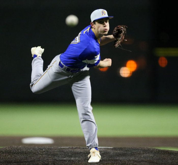 Georgia Tech commit. 6-foot-1, 180-pound right-handed pitcher, loose, athletic build. Works out of the stretch, short, loose arm action out of a sidearm slot, hops down the mound on his finish. Fastball sat 84-86, running action, created weak weak contact with. Slider, 76-78, sharp sweeping action. Facing a predominantly left-handed lineup, lived on the outer half with his fastball and then busted his slider in on the hands.