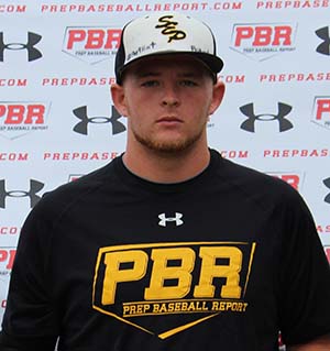 8/5/14: 6-foot, 220-pound catcher/ right handed pitcher. 5.1 home to first time. Right handed hitter, starts open and strides to closed. Minimal weight shift through ball at contact. High back elbow with uphill swing plane. Exit velocity of tee 85 mph. Defensively, strong hands, narrow base while receiving, stays open on throws to second, stands straight up. Arm strength of 72 mph. Pop times of 2.1-2.18. On the mound, simple delivery, good balance and direction to home. Arm works well out front and has some athleticism on mound. Breaking ball had hard late action and was an above average pitch. Fastball 82-85 mph. Curveball 67-72. Changeup 68-70. Showed best on the mound.