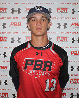6.21.16 - Bradley recruit. 6-foot-2, 180-pound left-handed hitting catcher, athletic build, wiry strength. Offensively, shows pull-side power potential. Hits from balanced setup, up-and-down leg lift, generates bat speed through shoulder rotation, uphill path, consistently lifts the baseball to the pull side. Registered 84 mph exit velocity with wood. Defensively, possesses strong arm, 80 mph from the crouch, excellent carry. Works uphill, slower transfer; top pop times ranged between 1.97-2.04. Ran a 7.34 laser-timed 60.