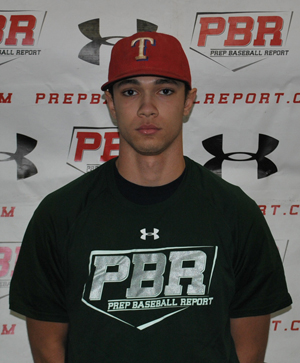 10/27/13 - Lanky, athletic frame, highly projectable build, 6-foot-3, 180-pound two way prospect. Projects well on the mound, high ceiling arm. Tall and fall delivery, shows some effort, athletic finish. Operates from an over the top arm slot, loose arm action, advanced arm speed. Fastball has run, hard heavy action, showed control, 84-85 mph. Curveball has potential, aggressive arm action, 11/5 plane, 67-71 mph, flashed occasional bite. Ran one of the best 60 times at the event (7.04). Defensively plays through the baseball with aggressive arm action, long over the top slot, 88 mph from the outfield with carry. Offensively hits from a balanced stance, short stride. Handsy swing, flat bat path, low finish. 82 mph exit velocity from the tee.