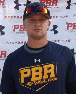 6/17/14 - 6-foot-3, 180-pound prospect with strong/athletic frame and room to fill in, shows good feet around the first base bag with playable hands, starts the double play well, 79 mph arm across the infield. At the plate, hits from a balanced setup, loads up on back side, wraps some in load with long/uphill swing path, creates some lift and shows some pull side power, showed his ability to generate bat speed with 90 mph exit velocity off the tee, ran 4.82 down the first base line, went 2-for-4 with a double in game play with a pull approach, prospect to follow in 2016 class. On the mound, arm is loose and works well, uses long arm action through a ¾ arm slot that produces some arm-side run and good sink to his fastball, fastball sat 82-83 mph, showed a 76-77 mph slider with short and late break, good command of both pitches and works both sides of the plate, allowed one hit and recorded four ground ball outs in the five hitters he faced in game action, more velocity likely to come, potential high-level prospect on the mound.