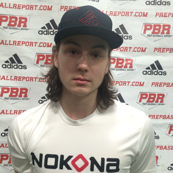 6-foot-1, 200-pound right-handed pitcher and corner infielder. The glove is soft in the infield and the feet can be smoothed out to aide the process. Threw 75 mph across the diamond out of a clean arm path. The bat has has a tee exit velocity of 85 mph. The setup is even in base and swing is rotational to contact. The hands are tied up, needs to loosen up to free up swing. On the mound, the fastball sat 76-77 mph, minimal arm side run. The spin pitch is good in shape, sitting 66-67 mph. The pitch needs additional fastball hand speed to the pitch. The changeup is 73 -74 mph, showed fade and action to the pitch. The delivery is online with the feet, post foot on top of the rubber and above 3/4 in slot. The tracking is online to the plate and the front side is posted. Solid delivery and repeated, threw strikes throughout the session.