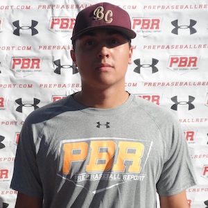 Big, physical right handed hitting third baseman who could also play first base if need be. Threw 77 across the infield with minimal effort, showing a solid approach to the ball and a solid glove. The slot is ¾ and the arm has plenty of carry to it. Ran a 4.9 on a dig to first base. The bat has a tee exit velocity of 90 to it. The setup is spread out and he uses his hands clean to the ball. The body is athletic and he shows good feel for the game. The swing could be shortened as the path to the ball is good. A few tweaks here and there and look out for this guy as he has serious leverage.