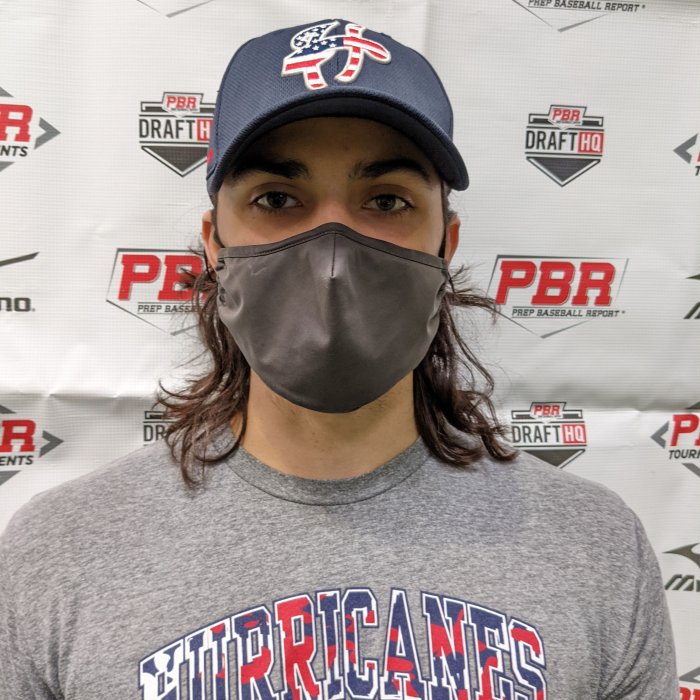 6-foot,180-pound right-handed hitting catcher. He ran a 7.71 sixty at the event. The skill set behind the dish is a work in progress. He threw 73 mph from behind the dish with a pop time of 2.2. The receiving can continue to soften and he can work on securing the catch while receiving the baseball. The transfer can improve with the quickening of the feet and an off-season throwing program. The bat has an exit velocity of 90 mph. The setup is wide in base and the front foot steps into the swing. The path is long in path and his weight gets to the front foot very early in the process.