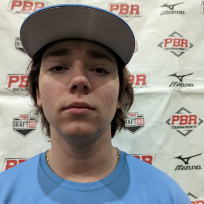 6-foot-3, 195-pound right-handed pitcher and left-handed hitting first baseman. The approach in the field is solid, moves the feet and handles himself around the bag. The arm is clean, throwing 71 mph across the diamond at the event. The bat has an exit velocity of 84 mph. The setup is close with the feet and the front foot is open to start. The front foot closes down and the path is long and strong to contact. The finish is 1-handed and he gets through the baseball. On the mound, the fastball sat 74-76 mph. The breaking ball was 67-68 mph and the changeup is still developing. The delivery has crossfire to the feet and the slot is above 3/4 height. The lift is repeated, solid in tempo and he moves well for a big kid. The slot needs to remain consistent.