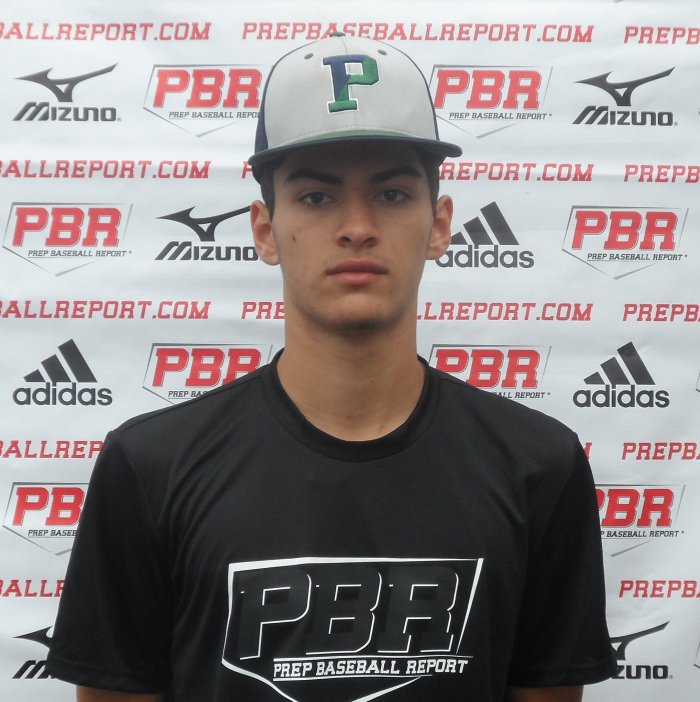 5-foot-10, 150-pound right-handed hitting middle infielder and pitcher. Ran a 7.32 sixty on the laser at the event. The approach in the infield is athletic and he stays active with his feet. The glove is average and he gets rid of it quickly. Threw 77 mph across the diamond. The bat has a tee exit velocity of 79 mph. The setup is wide in base, simple pick up and put down of the front foot as the ball approaches. The path is flat and clean to contact. Needs to add physical strength to aid the development of his game. On the mound, the fastball sat 76-77 mph, minimal arm side action to the pitch. The spin pitch is 65-68 mph, big in shape. The changeup shows some fade at 71 mph. The delivery is online with the feet and above 3/4 in slot. The tracking of the front shoulder comes offline prior to foot strike, taking away from his direction. The arm is free, and he shows recoil at release.