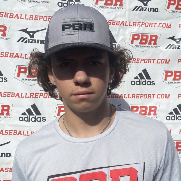 5-foot-9, 165-pound right-handed hitting outfielder and right-handed pitcher. The bat has an exit velocity of 90 mph. The setup is narrow in base with the front foot open to start. The front foot closes down as the ball approaches the hitting zone. The hands are free and clean, showing a flat path to contact. On the mound, the fastball sat 74-75 mph with minimal arm side run to the pitch. The spin pitch was 67-68 mph and solid in shape. The changeup is a work in progress, sitting 69-70 mph. The slot is 3/4 and the tempo is methodical in tempo. The action is repeated.