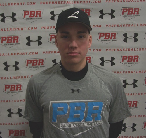2.21.16- Athletic projectable frame at 5-foot-10, 155-pounds. Ran a 7.35 60-yard dash. Hits from a slightly open stance, slightly stacked. Smooth load to hitting position. Short path to the ball with some lower half usage. Shows some bat speed in swing with some extension through contact. Nice balance through swing, gets a bit on his back foot at end. Nice rhythm in swing and has an exit velocity of 82 mph. Active feet with short steps. Works thru the ball well. Short arm action with some elbow lift. Throws from a high ¾ arm slot at 74 mph. Interesting skill set for young prospect especially as he fills out frame. One to keep an eye on.