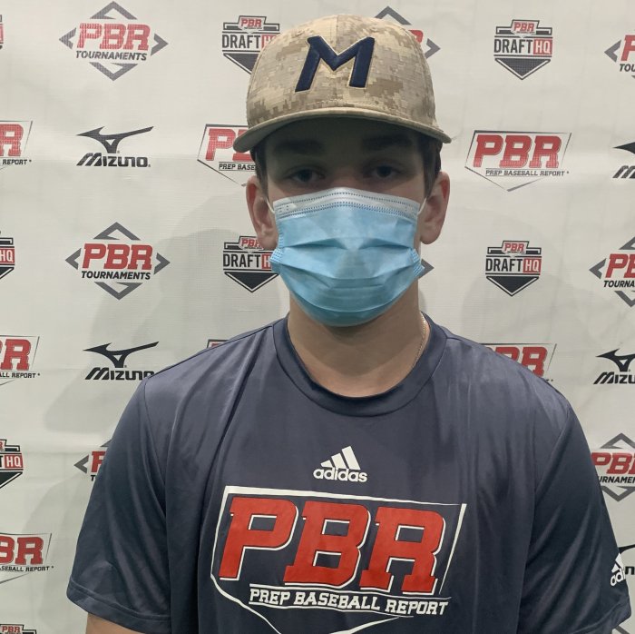 Nic Frink: C/RHP, (2022) Scarborough, ME. 6-foot-1, 200-pound lean frame. Above average during batting practice, the right-handed hitter had a max exit velocity of 97 mph. Begins in a wide stance with a controlled load, then uses a small leg kick. Bat speed was explosive, showed an uphill swing plane and high finish. Through the round he found multiple barrels with loud contact. Aggressive approach. Laterally, his movements were athletic. Behind the plate, throw downs to second were maxed at 76 mph; had a quick exchange, soft hands, and athletic footwork. Showed his ability to throw runners out with an efficient pop time of 1.90-2.03. Athletic setup with average flexibility. Consistent accuracy to the bases, used a short arm action with a high ¾ slot. Above average on the mound, had a quick arm action and a high ¾ arm angle with above average arm speed. Up-tempo type pitcher and uses some effort. In his delivery his balance point is tall with falling off shoulders. Lands open with a falling off finish. Threw his fastball 84-85 mph; has a heavy fastball that shows control around the zone and running action. Threw a 11/5 curveball (67-68) that showed tight action and around the zone command. Threw a straight changeup (74-75) that showed sinking action and around the zone command. Showed glove side control and tight action on his slider (71-73).