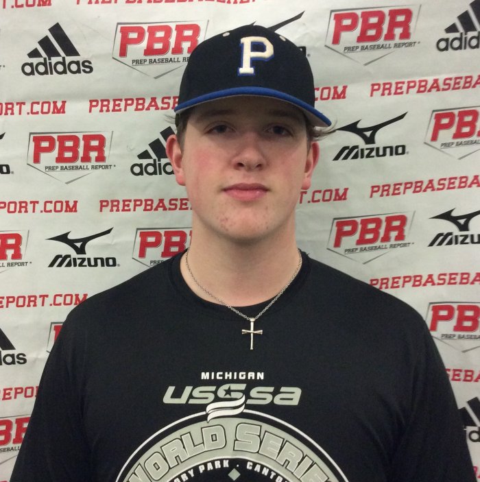 Brendan Burch: LHP/1B, (2022) Plainwell, MI. Lawrence University Commit, 6-foot-2, 225-pound solid frame. Solid at the plate, the left-handed hitter's 89 mph exit velocity showed his ability to drive the ball with power. Started in a balanced stance with a controlled arm bar load, then used a quick stride before his swing. Bat speed is above average, has upward swing plane and high finish. Produced a lot of loud contact and found some barrels. Aggressive approach. Solid in the infield, recorded a position velocity of 69 mph; has soft hands, consistent feet and a clean exchange. Consistent accuracy to the bag, used a high ¾ slot and a quick arm action. In the 60-yard dash, his time was 8.14. Solid on the mound, showing some arm speed he used an over-the-top arm angle with a loose arm action. Tilt-and-topple type pitcher and shows some effort. Tall balance point with downhill shoulders. Lands open with a clean finish. Changeup (66-67 mph).Threw his fastball 72-73 mph; had consistent control and tailing action. His 1/7 curveball (62-63) has consistent command and sweeping action.
