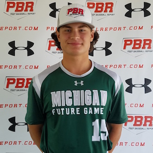 Texas A&M recruit, currently ranked No. 87 overall, No. 3 in Michigan’s 2018 class. 6-foot-1, 195-pound right-handed hitting outfielder, proportionally strong quick-twitch athlete. Delivered an all-around impressive performance at the Midwest ProCase, showcasing high-level tools across the board. Offensively, hits from a relaxed, slightly open setup; fluid pre-pitch rhythm, swings with controlled aggression; generates explosive bat speed, stays strong through the ball, maintains balance through contact. Has quieted down the swing since last look; repeats well, stays inside, knows how to backspin a baseball with loft. Tanked a few taper-blasts in BP. Registered 97 mph exit velocity with wood. Ran a 6.71 laser-timed 60 and was clocked at 91 mph from the outfield. Moves around the outfield with confidence, throws have carry from high-3/4 slot. Overall established himself as a high-follow draft prospect moving forward.