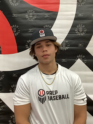 Hits: RHH. Narrow base, tall stance with slight knee bend, hands start at midline and work back at load, high leg kick trigger. Strong hands with bat speed, level bat path with intent to elevate to the pull-side. Well advanced bat strength for age.
