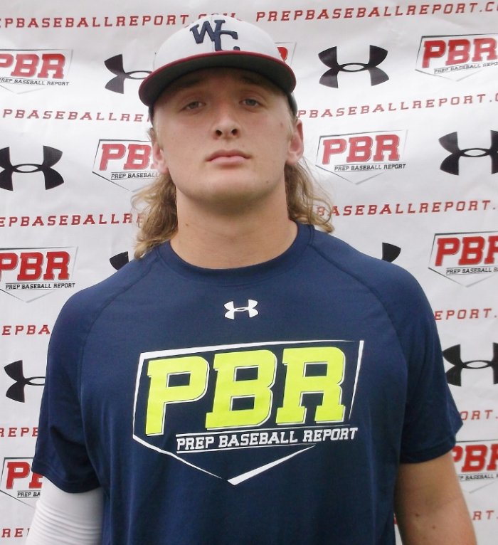 7/14/15 -Mickey is a 6-foot-1 210-pound right-handed hitting outfielder and right-handed pitcher. He has a 93 mph exit velo, top of the event and ran a 7.22 60. Mickey has an aggressive swing, uses a leg kick, strong lower half, quick hands to extension, high finish, mostly line drives to middle of the field. In the outfield, gets behind ball, plays through catch, over-the-top release, loose arm action, 82 mph positional velo, one of the top for the event, accurate throws. On the mound, posted to top fastball velo of the event at 84 mph, simple/repeatable delivery, lifts knee with hands, stays in line down the mound, high-three quarters slot, throws with some effort, 82-84 mph fastball, tight 12-to-6 breaking ball, 65-68 mph, 67-71 mph change-up.
