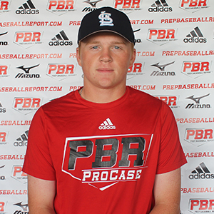2/10/18 - Schork is a durable 5-foot-11 210-pound left-handed hitting catcher and right-handed pitcher in Missouri’s 2020 class. He ran a 7.34 60 and has a 90 mph exit velocity. At the plate, tall stance, slightly open, minimal stride, smooth load to back side, minimal hand load, stays under control, loose hands with gap to gap line drives. Behind the plate, pop times between 2.06 and 2.21-seconds, 78 mph positional velocity, over the top arm slot, short arm action, arm works, thin set up in base, most throws have carry, somewhat accurate. On the mound, Schork has a sturdy build, aggressive delivery, over the top arm slot, loose arm action, works downhill, has command of three pitches, fastball at mostly 84-86 mph, some with heavy cutting action, breaking ball has 11-to-5 shape, late and sharp action, lands for a strike, change up is thrown with near fastball arm speed, 65-69 mph, arm side sink.