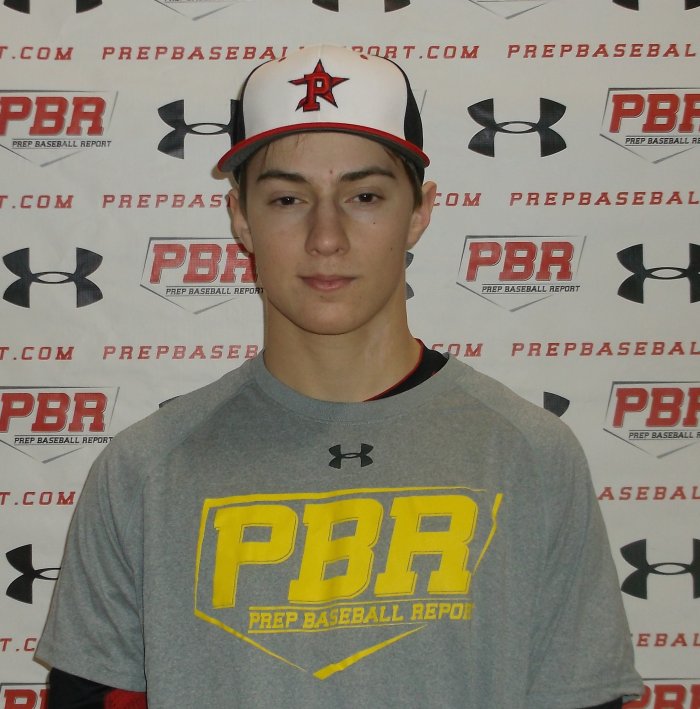 8/14/16- 6-foot-3, 195-pound right-handed hitting two-way player ran a 7.08 60 yard sprint. Strong physical build with a strong base. At the plate has a wide base, toe tap trigger to a quick compact line drive swing plane. Tendency to spin off to the pull side. Posted an exit velocity of 85 mph off a tee. In the outfield, showed the ability to read the ball and has a long ¾ release that topped out at 89 mph. On the mound, sat in the 82-85 mph range with his fastball. Mechanically, repeats delivery, tendency to drift towards home before hands break. Aggressive front side stays closed. 71-73 mph breaking ball has tight spin and was up in the strike zone.
