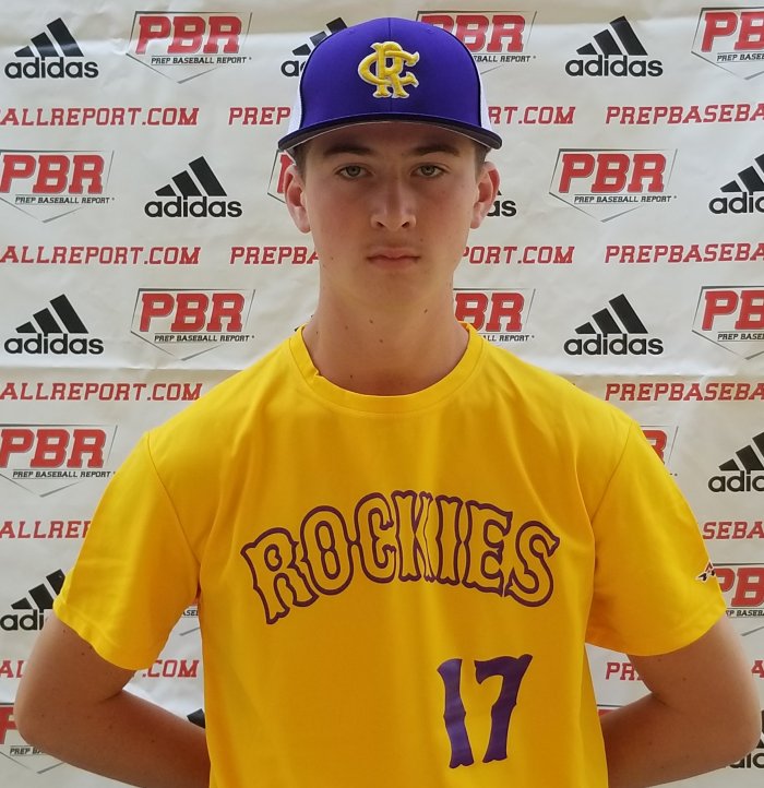 First baseman caught the ball consistently with some stiffness in the hands. Controlled, cautious exchange to a long arm action. Showed accuracy on multiple types of throws, topping at 67 from the position. Left handed hitter starts in a tall, balanced stance. Front arm almost barred in setup as back elbow works from a high position. Short stride. Level bat path working to rotate on the back leg, showing a pull tendency. Ran an 8.42 sixty.
