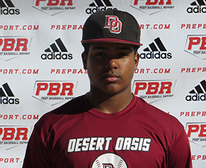 Oregon recruit. Walsh’s physicality is immediately apparent at 6-foot-4, 215-pounds, and he carries it well with enough athleticism to produce a 6.99 60-yard dash time. His powerful stroke from the left side is sure to gather some MLB scouts at Desert Oasis games throughout the spring, and he gave a glimpse at that power throughout batting practice including home runs to the pull side that travelled as far as 388 feet per Trackman reports. Starting upright and square with the hands in constant movement, Walsh utilizes a leg kick that hangs to initiate separation of the hands with a near-exaggerated wrap into a power position. From there, a concerted effort to work uphill and lift the ball is seen with quickness of the hands. There was minimal effort for Walsh to create such force on the ball, and he had some of the top rotational acceleration of any player at the event. Walsh is relaxed in all his actions and demonstrates an ability to slow the game down at the plate and in the field. He battled deep into a count in one live at-bat before lining a single to the opposite field to showcase ability to cover the plate. However, the power potential is what is sure to excite MLB clubs, and should he carry his successes of previous years into this spring, Walsh may have an opportunity to be a Day 2 selection in July.