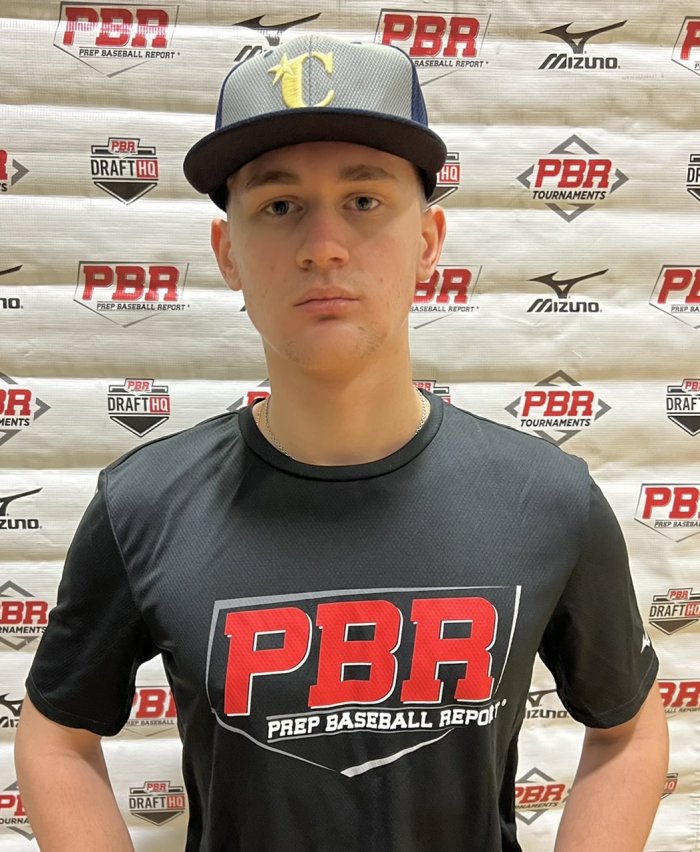 Offensively: RHH. Even setup, with feet just outside his shoulders; bat positioned at a 45 degree angle. Short take back with the hands with a slight leg-kick for timing. Drifts into contact while showing a strong lower half. Showed a slight lift to the ball with a two handed finish. More flyballs than line drives and groundballs with a peak exit velocity of 95 MPH via Trackman. Impressive bat speed produces high exit velocities. Quick twitch swing with tilt.