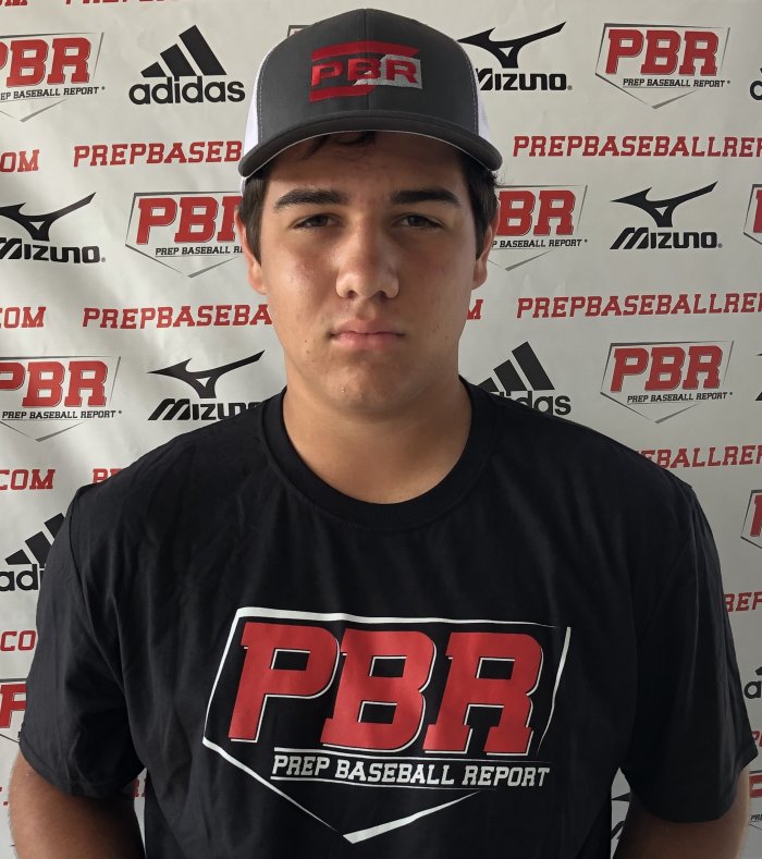 A strong build at 5-foot-8, 170 pounds. Ran a 7.92 in the 60 yard dash. Offensively- the right handed hitter stands in the box in a tall stance feet shoulder width apart. Quiet load actions. Quick direct path to the baseball. Stays balanced throughout the swing. Hard consistent contact during batting practice. Top exit velocity was 83 MPH. Defensively- the infielder displayed active footwork. Above average exchange and a quick release from a high ¾ arm slot. Lot effort throwing actions. Top throwing velocity from the infielder was 74 MPH. Pitching- the right handed pitcher displayed a repeatable delivery and a projectable live arm. Low effort delivery. Works downhill from a balanced backside. Showed plus FB command peaking at 75 MPH. CB has an early tight spin ranging from 53-56 MPH. The 2023 graduate will be on to follow. Impressive performance in the game with hard consistent contact and a strike thrower on the mound.